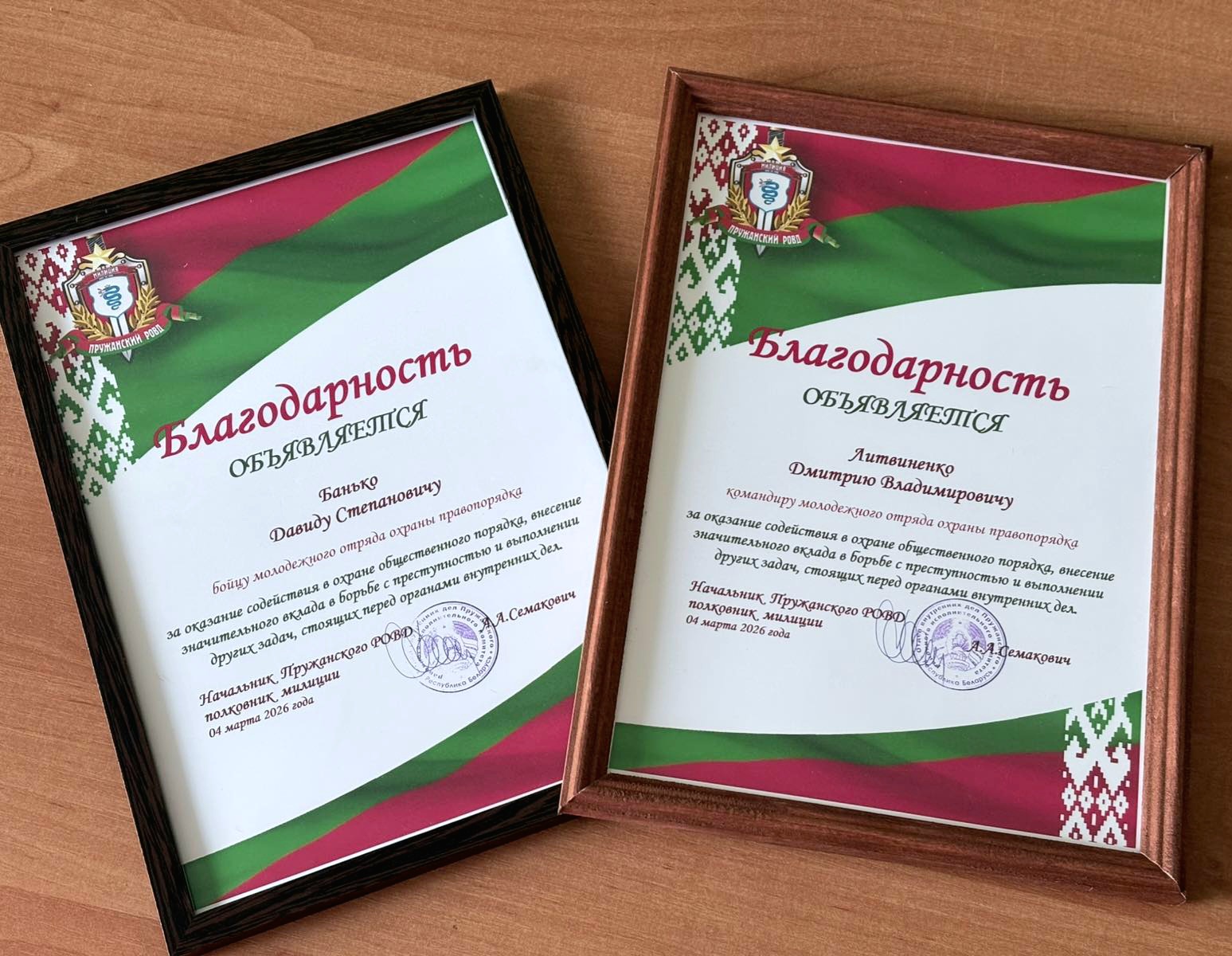 4 марта в Пружанском РОВД на торжественном собрании посвящённом Дню милиции, учащимся колледжа членам Молодёжного отряда охраны правопорядка «Легион» колледжа Литвиненко Дмитрию и Банько Давиду были вручены благодарности «За оказание содействия в охране общественного порядка, внесение значительного вклада в борьбе с преступностью и выполнении других задач, стоящих перед органами внутренних дел».